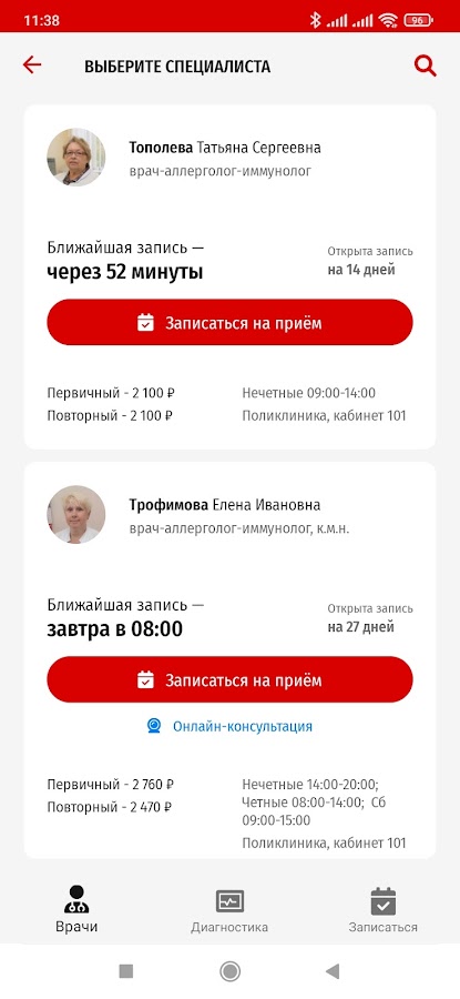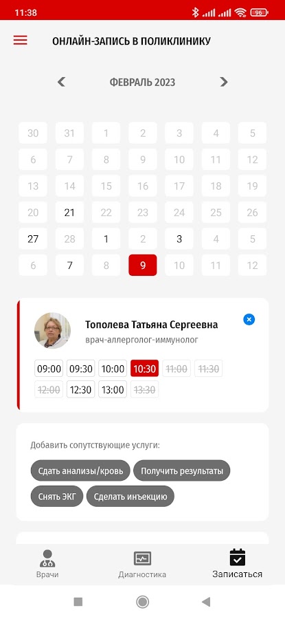 Запись на консультацию врача и диагностику с уникальной функцией планирования визита к нескольким специалистам в один день. Онлайн-заказ пропуска на автомобиль, онлайн-оплата, электронный QR пропуск на территорию.