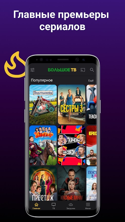 Большое ТВ — ваш персональный онлайн-кинотеатр. Вы можете смотреть фильмы, сериалы и мультики на телефоне или отправлять их на Smart TV одним нажатием.Загружайте фильмы и смотрите их без интернета. Получайте уведомления о новинках кино