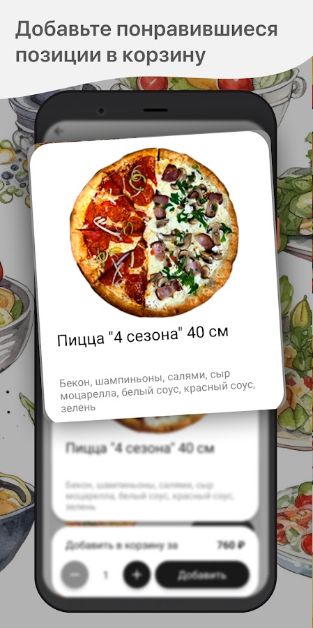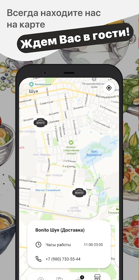 Как сделать заказ в приложении “Бонито”: выберите понравившиеся позиции из меню, добавьте их в корзину и перейдите на экран оформления заказа (по нажатию на иконку корзины).