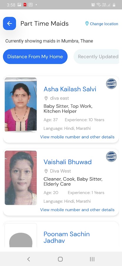 Преимущество приложения заключается в том, что вам не нужно связываться с охранником или искать нянь по телефону. Просто указав местоположение вашего дома в приложении, вы получите прямой доступ ко всем горничным, проживающим в радиусе 3 километров от него. Профиль каждой горничной включает её фотографию, имя, возраст, опыт работы, страну проживания и другую важную информацию, которая поможет вам принять взвешенное решение. В приложении также есть горничные из Дели, Хайдарабада, Сурата, Ахмадабада, Калькутты, Ченнаи и других городов. Это универсальное решение для всех ваших потребностей в горничных. Через приложение вы также можете запросить проверку биографических данных горничной, которая у вас уже есть или которую вы хотите нанять в будущем.