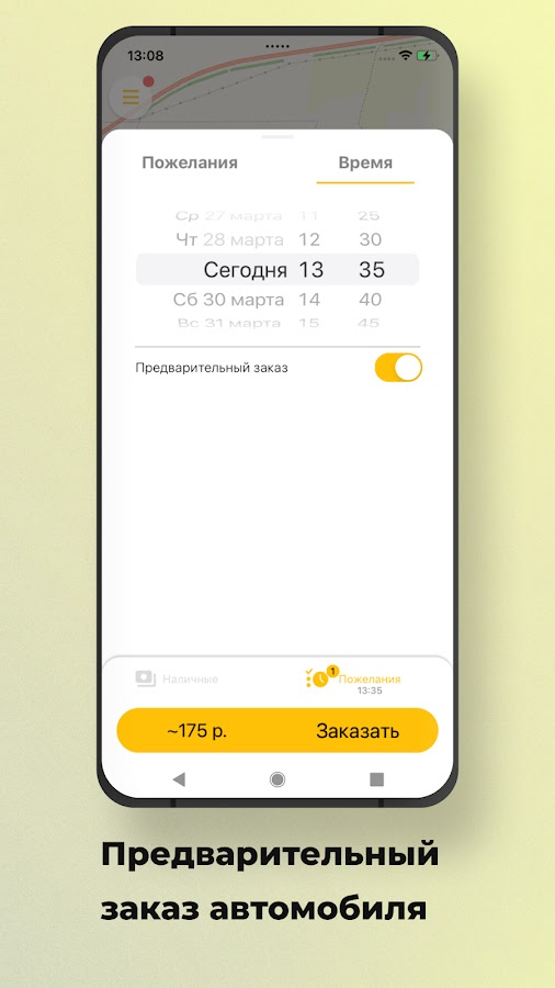 Выберите опцию «Предварительный заказ». Поиск автомобиля начнется незадолго до заказа поездки, и автомобиль приедет к назначенному времени. Также вы будете заранее знать стоимость поездки.