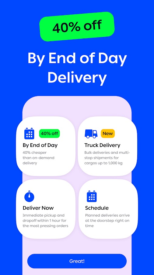 Отслеживание в реальном времени: Отслеживайте доставку в тот же день в режиме реального времени и делитесь статусом с клиентами.