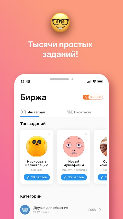 В разделе «Биржа заданий» вы сможете найти тысячи простых заданий от таких же как вы пользователей приложения. Каждую минуту выполняются сотни заданий и появляются новые.