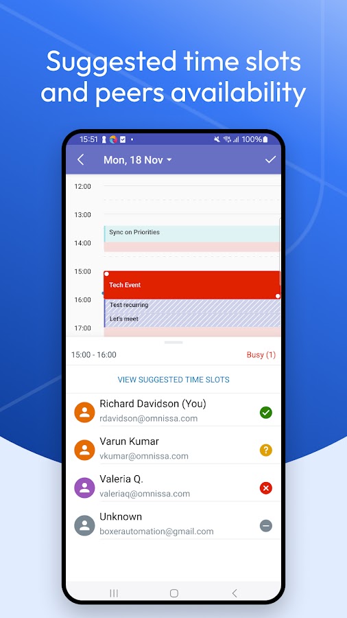 Полнофункциональное управление календарем находится всего в одном касании, позволяя вам всегда быть в курсе своего расписания. Легко создавайте события и управляйте ими, просматривайте вложения календаря, отправляйте приглашения на встречи и просматривайте доступность внутри Boxer.