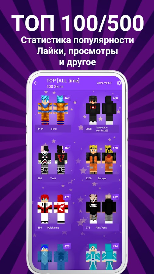 Скинпак содержит: скины с белыми глазами, скины для игроков, скины в толстовке с капюшоном, в наушниках, мобов, нубов, военные скины, гриферы, камуфляжные скины, скины супергероев, скины трансформеров, скины из звездных войн, момо, Фредди, Тень Фредди, Фантомы, Плачущий ребёнок, аниматроников, летсплейщиков, зомби, скины ужасов, кровавые скины, скины животных, медведей, Винни, роботов, с бородой, с усами, космические скафандры, скины астронавтов, спортивные скины, скины гопников, приведений, скины хиробрина, ютуберов, стримеров, в трусах, скины циклопов, гоблинов и мутантов, скины анонимус, скины солдатов и войнов, скины ассасинов, космических штурмовиков, из мортал комбат, скины популярных реперов, сказочных героев, Фокси, Чики, скины реальных пацанов, сумасшедших, ученых и многие другие популярные скины вы можете найти в этом приложении.