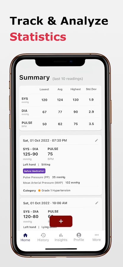 Если вы не уверены, к какой зоне артериального давления относится ваш результат, вы можете найти надежные и автоматически рассчитанные ответы на основе рекомендаций AHA / ACC, рекомендаций ESC / ESH, а также вы можете установить свои собственные пользовательские категории. В дополнение к этому вы также можете проверить пульсовое давление и среднее артериальное давление, которые рассчитываются автоматически.