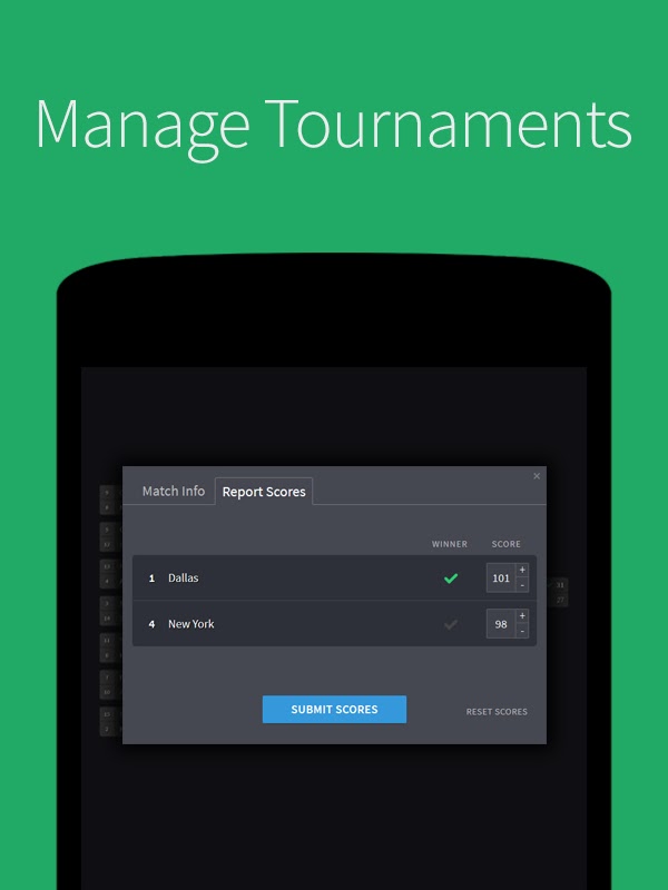 Отправляйте результаты матчей и предоставляйте живые обновления брекетов на протяжении всего турнира с помощью инструментов и функций брекмейкера.