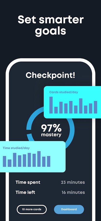 Brainscape устанавливает для вас индивидуальное ВРЕМЯ повторения каждой карточки на основании данных доказательной когнитивистики. Если вы изучаете язык, готовитесь к экзамену или просто узнаёте что-то новое для собственного интереса, Brainscape устанавливает частоту повторений каждого понятия в соответствии с правильными интервалами работы для ВАШЕГО мозга.