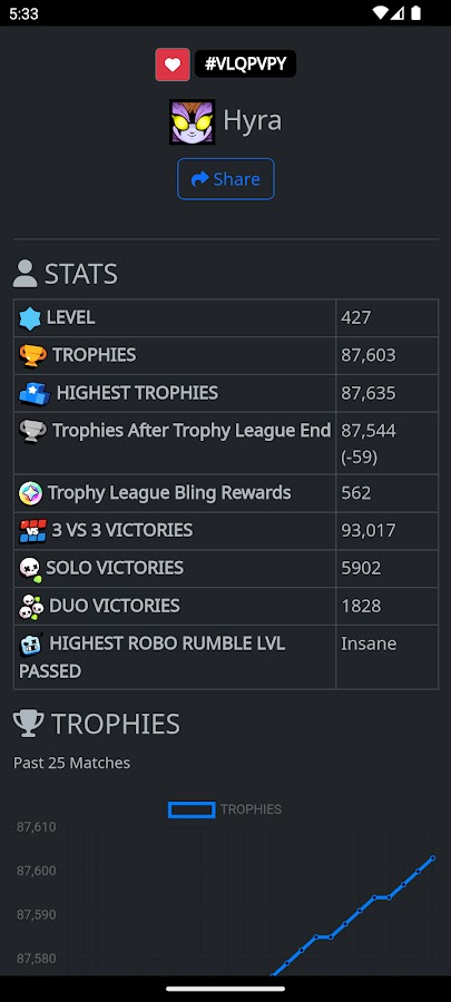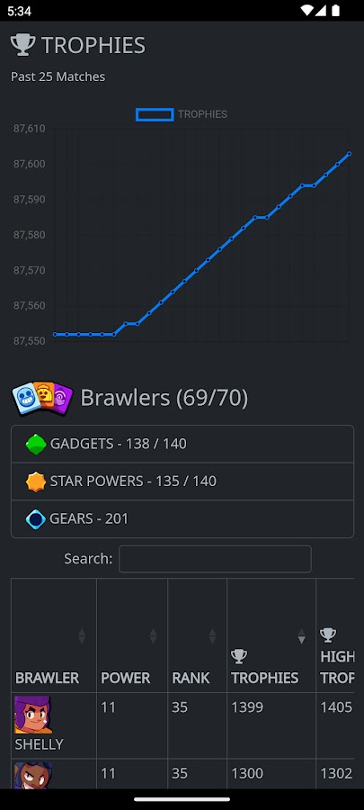 — Получайте статистику игрока, включая процент побед, графики трофеев, журнал битв, статистику колоды.