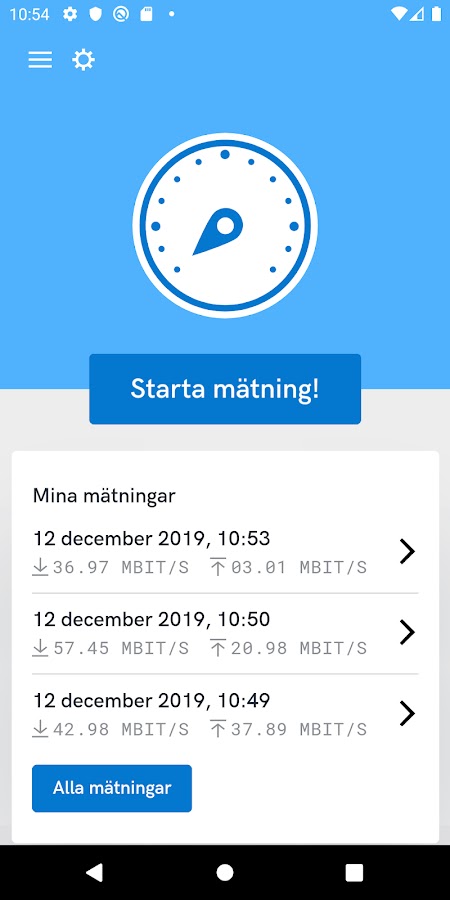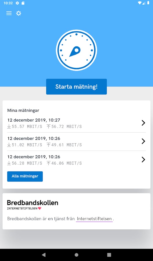 После того, как вы загрузили и установили Bredbandskollen на свой мобильный телефон, вы можете измерить скорость, которую вы получаете от своего оператора мобильной связи, время загрузки и загрузки плюс любые задержки. Приложение простое в использовании и совершенно бесплатное. Ваша конфиденциальность защищена, ваша информация полностью анонимна. Персональные данные, которые мы храним, представляют собой IP-адреса.