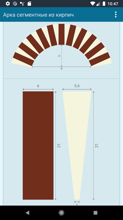 Кирпичный калькулятор (Voussoirs). Является полным приложением, где вы можете проектировать и вычислять кирпичную арку для дверей, окон, камина или простой арки и длины дуги. Идеально подходит для всех, кто должен знать, сколько кирпичей требуется для сборки арки.