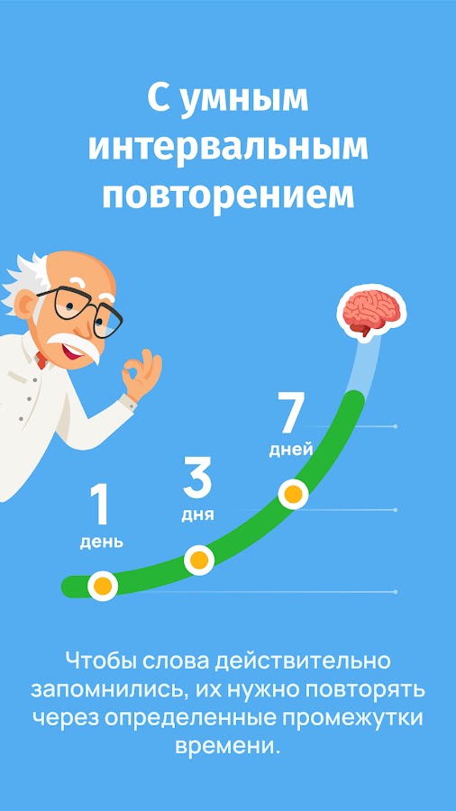 Bright использует топ-метод интервального повторения и специальную технику тренировки памяти Fast Brain. Благодаря интерактивной форме обучения пользователи запоминают 90% информации.