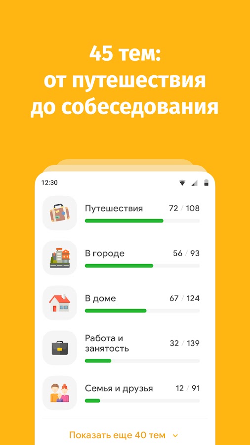 Мы подготовили 45 наборов английских слов с разными уровнями сложности: от новичка до эксперта. Упражнения озвучены носителями языка.