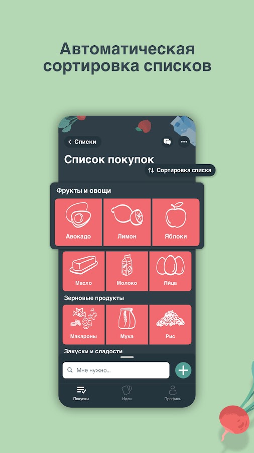 ✔️ Группируйте товары в списке покупок по категориям продуктов.
