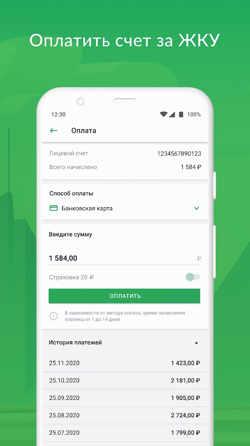 — Просмотр истории платежей и начислений за ЖКУ;