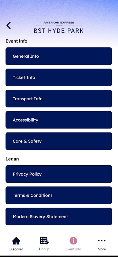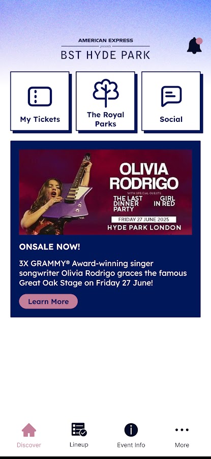 Лучший спутник вашего American Express — это опыт BST в Гайд-парке. Надежно храните билеты и получайте к ним доступ, просматривайте состав участников, создавайте собственное расписание после того, как будет опубликовано установленное время, и будьте в курсе обновлений событий, информации и предложений в режиме реального времени.