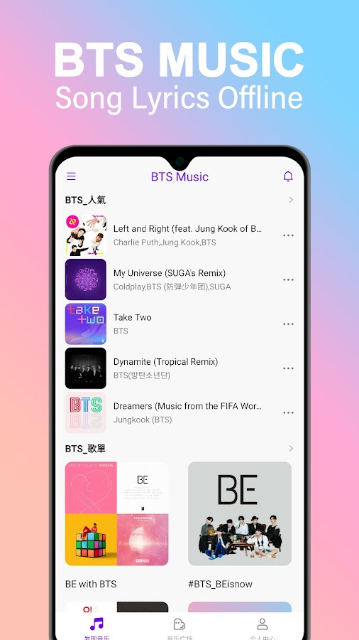 В этом бесплатном музыкальном приложении есть все участники BTS, такие как Чонгук, Ви, Чимин, Шуга, Джин, Джей-Хоуп и РМ. Вы можете наслаждаться бесплатными песнями BTS как онлайн, так и офлайн, искать свой любимый трек BTS и просматривать плейлисты BTS, созданные нашей командой. Скачивайте песни BTS, которые хотите, создавайте плейлисты и делитесь ими, а также слушайте их в любое время без ограничений!