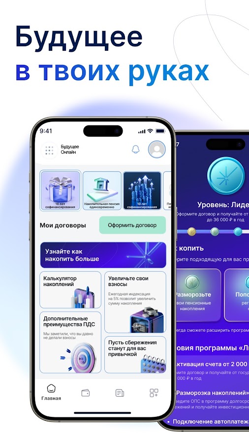 Вступайте в Программу долгосрочных сбережений в приложении АО «НПФ «БУДУЩЕЕ» (далее — НПФ «БУДУЩЕЕ», лицензия № 431 от 30.04.2014). Удобный интерфейс поможет быстро оформить договор и перевести накопительную часть пенсии (обязательное пенсионное страхование — ОПС) в ПДС.