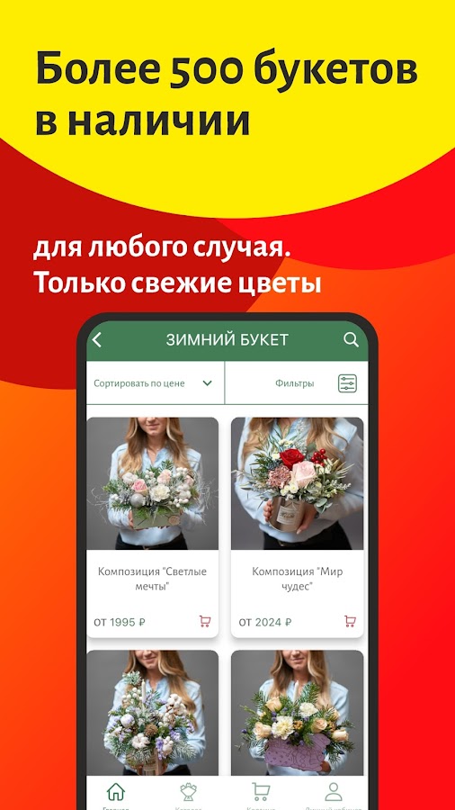 В приложении огромный выбор — можно купить как готовое решение от флориста, так и оформить Ваш подарок на свой вкус. Мы предлагаем розы, хризантемы, лилии, пионы, гортензии, ромашки, ирисы, кустовые розы и другие цветы.