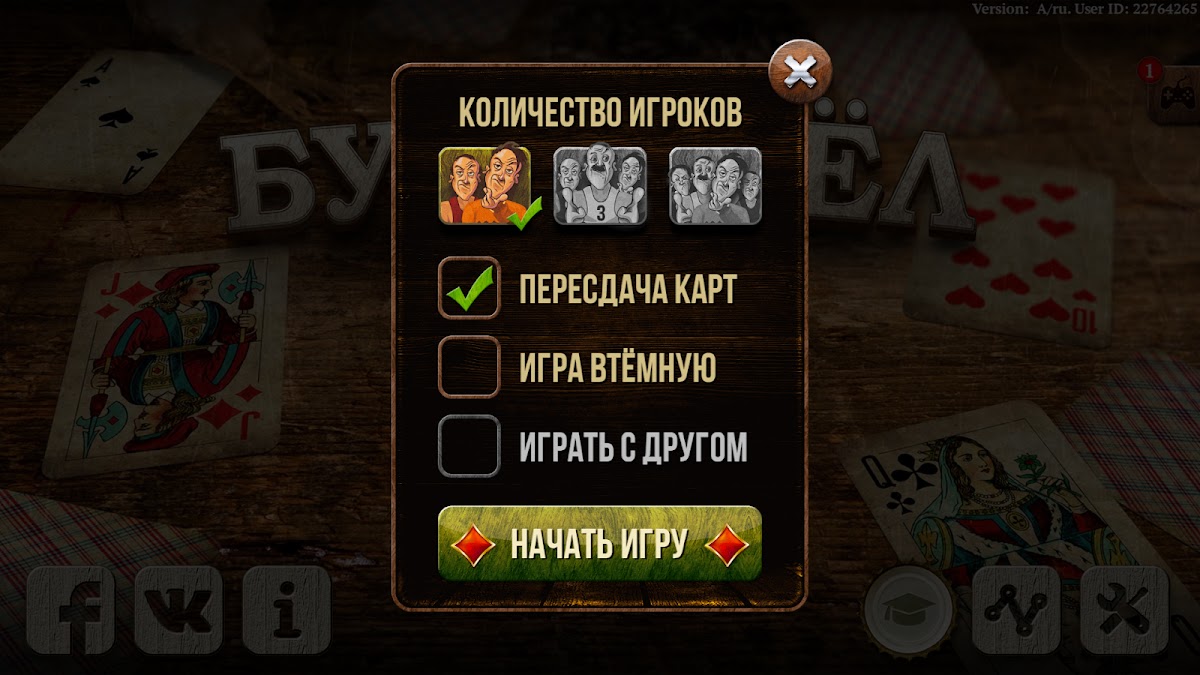 ☆ Дополнительные настройки: возможность играть втёмную или пересдавать при наличии всех 4 карт одной масти у игрока