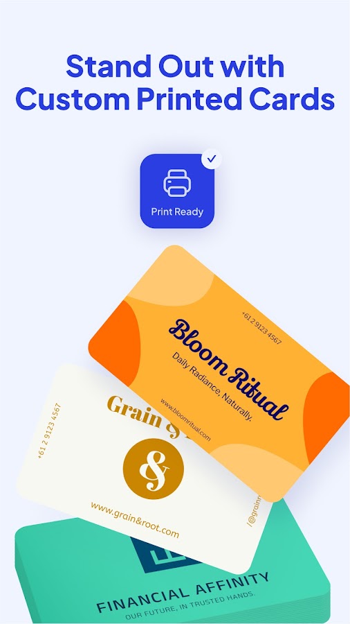 • Готовность к печати с высоким разрешением: с помощью этого всего в одном приложении вы можете отправлять бизнес-карточки на печать — нет необходимости загружать, непотребно тратить время.