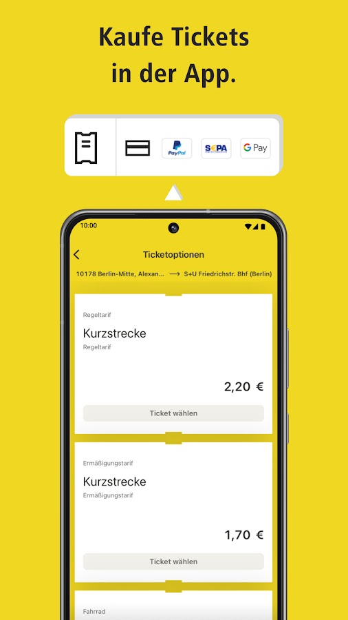 После того, как вы выбрали лучший маршрут для своего путешествия по сети Берлина, вы можете купить билет. Чтобы купить билет на любой автобус, трамвай, S-Bahn или метро с помощью приложения, просто нажмите на желаемый вариант путешествия или маршрут, перейдите к билету, и можно начинать!