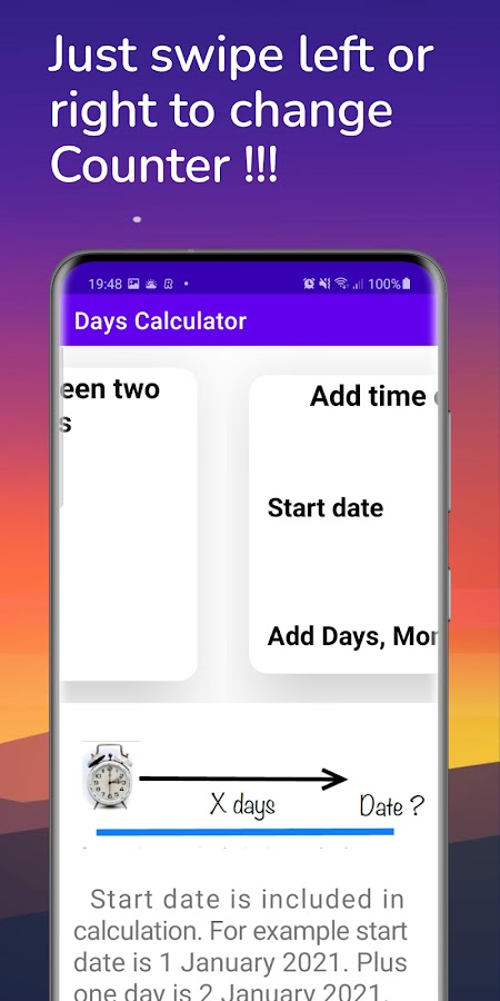 Простой счетчик дней для подсчёта дней, месяцев, лет между двумя выбранными днями. Вычислите, какой день будет через дни, месяцы или годы. Работает как калькулятор даты. Просто свайпните влево или вправо, чтобы переключаться между калькуляторами. Бесплатно. Легок в использовании.