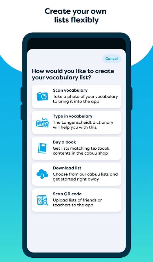 Благодаря функции сканирования вы можете перенести свой словарный запас в приложение всего за несколько секунд: оно распознает не только печатные, но и (разборчивые) рукописные списки.
