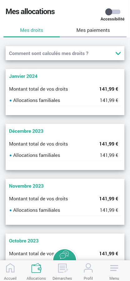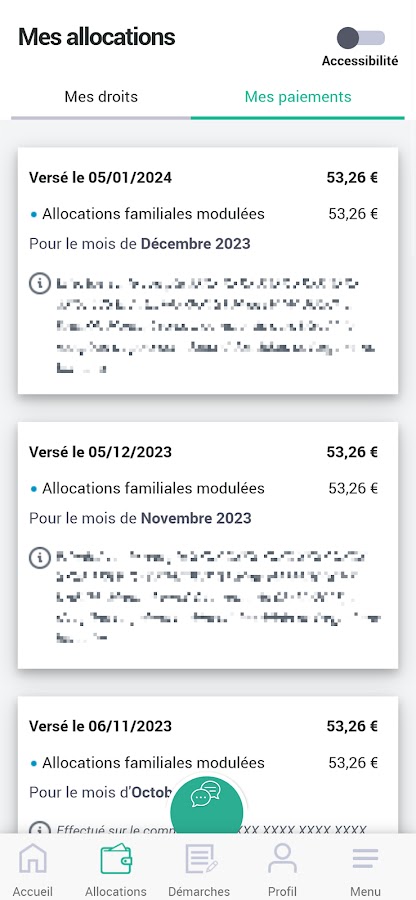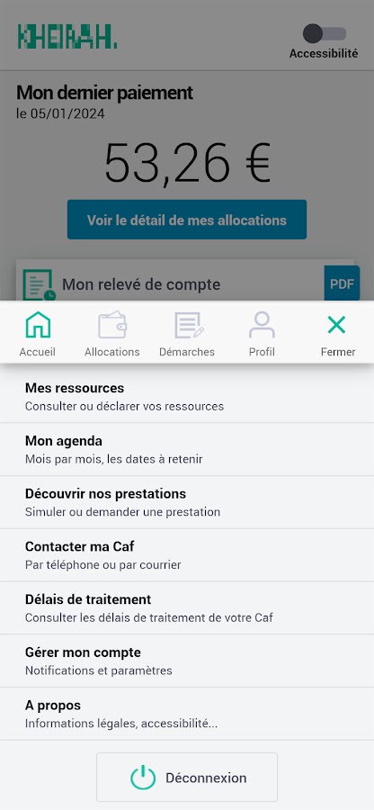 Приложение запрашивает у вас разрешение на доступ к вашим фотографиям/медиафайлам/файлам, чтобы вы могли при необходимости прикреплять подтверждающие документы, и статус вашей сети Wi-Fi, чтобы проверить ваше соединение в случае ошибки приложения. La Caf по-прежнему очень обеспокоен безопасностью и уважением ваших личных данных. Чтобы войти в систему, вы должны использовать свой номер социального страхования и свой личный (буквенно-цифровой) пароль. После первого подключения вы также можете подключиться с помощью биометрии (отпечаток пальца и/или распознавание лица) или устройства FranceConnect.