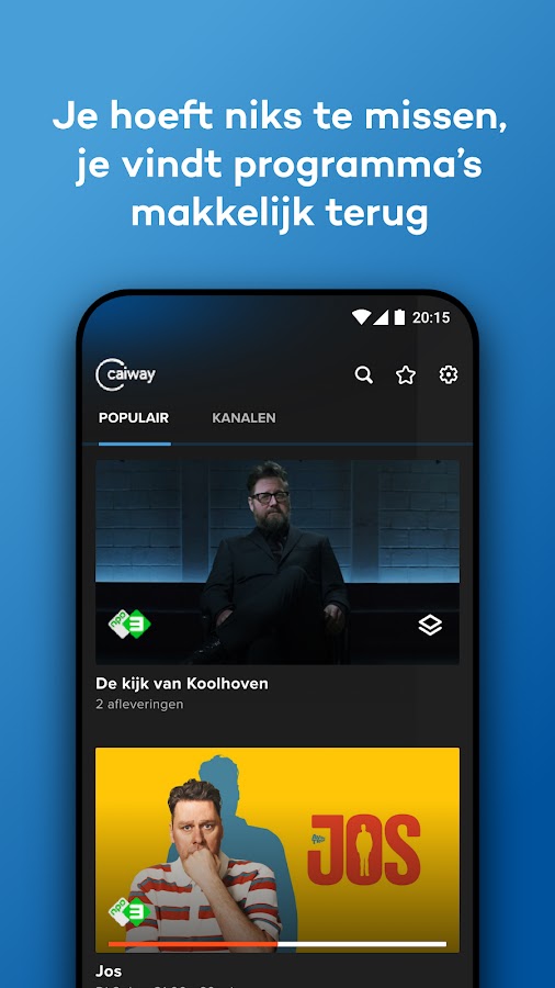 Загрузите приложение Caiway Interactive TV и войдите в систему, используя свое имя пользователя и пароль. Для получения дополнительной информации посетите caiway.nl/telflix-en-radio/interreken-tv-app/nieuwe-userer. Приложение Caiway Interactive TV можно загрузить бесплатно.