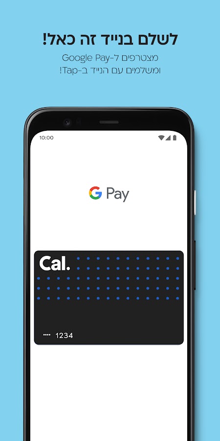 — Google Pay — новый и более удобный способ совершать платежи с мобильного устройства в Израиле и за рубежом (некоторые карты Cal). Вы можете зарегистрироваться в Google Pay из приложения. Вы можете оплатить, поднеся устройство рядом с платежным терминалом.