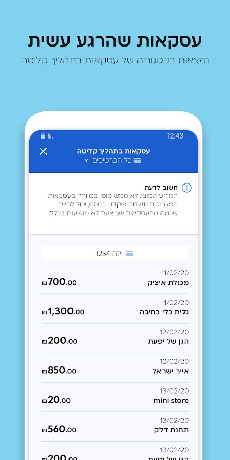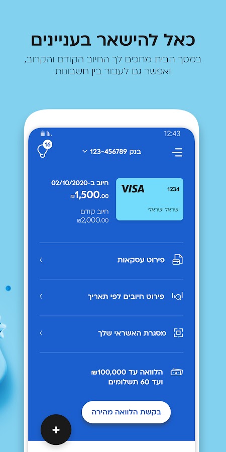 Вы также можете легко отслеживать транзакции, которые вы совершили в Израиле и за рубежом (включая кредиты и незавершенные транзакции), изменять дату выставления счета, увеличивать кредитную линию, контролировать свои счета, останавливать прямое дебетование, подать заявку на кредит, просматривать свой секретный код, поиск транзакций и многое другое…