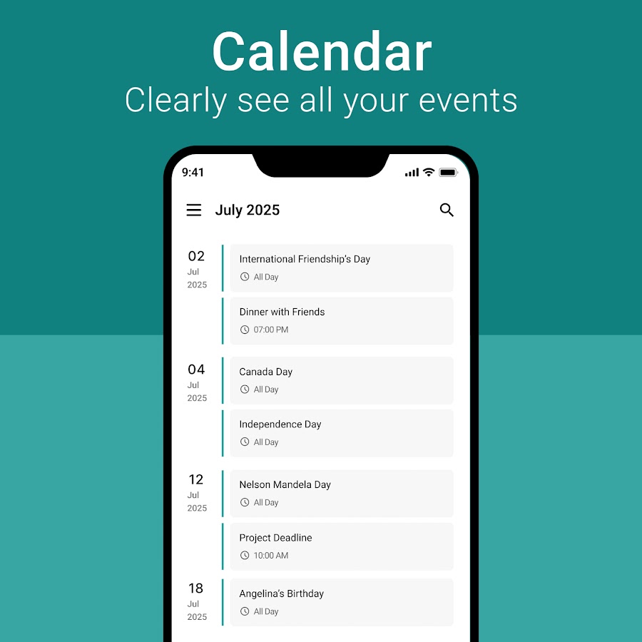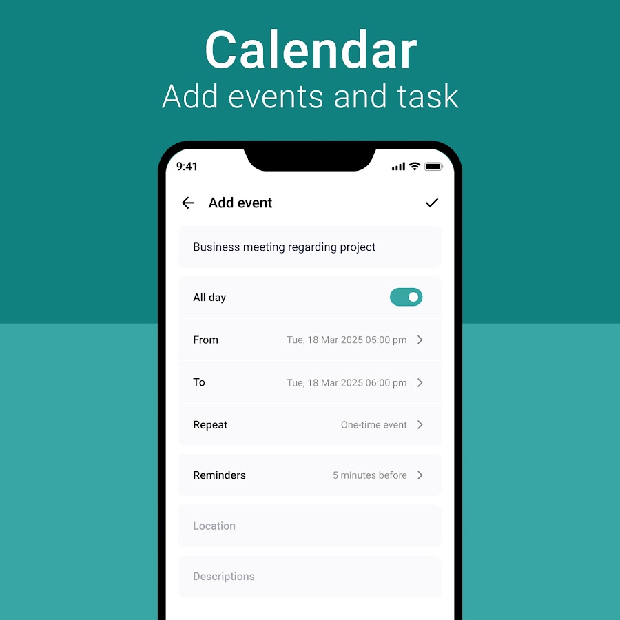 Будьте в курсе важных дел с помощью простых, но эффективных инструментов напоминаний. Создавайте и расставляйте приоритеты задач, устанавливайте сроки выполнения и добавляйте заметки к событиям. Используйте цветовые метки для лучшей организации. Интеллектуальная система напоминаний приложения гарантирует, что вы никогда не пропустите встречу, день рождения, праздник или личное событие.