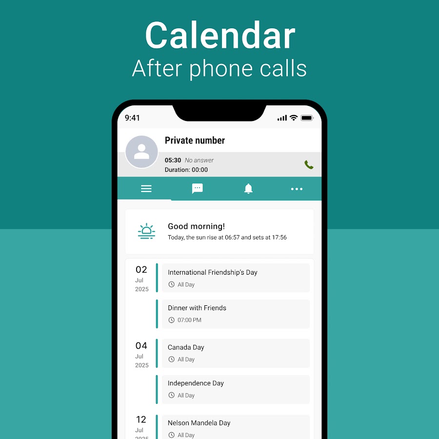 Приложение Calendar 2026 также включает функцию «После звонка», позволяющую пользователям просматривать свои предстоящие события сразу после завершения разговора. Будьте всегда готовы, мгновенно просматривая свое ежемесячное или годовое расписание и управляя ежедневными коммуникациями.