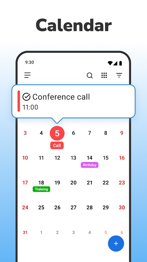 Создавайте события с лёгкостью, добавляйте повторяющиеся напоминания, места проведения и описания. Никогда больше не пропустите встречу или тренировку в спортзале благодаря множеству вариантов напоминаний, доступных в календаре.