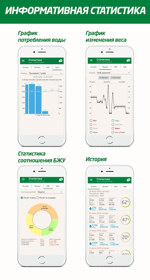 • Обширная статистика (контроль БЖУ, калорийности, потребления воды, графики веса и объемов, диаграмма соотношения БЖУ).
