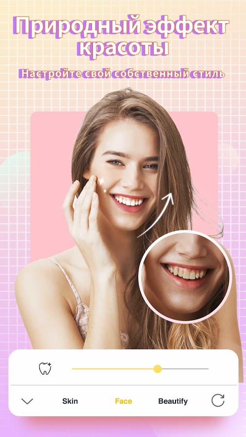 Большие глаза, очаровательные губы, утонченный нос и изящные черты лица… Приложению Beauty Camera прекрасно известно о том, что Вам нужно! Усовершенствуйте свои селфи-снимки с помощью наших инструментов, созданных для простого и быстрого использования, и получите прекрасные результаты