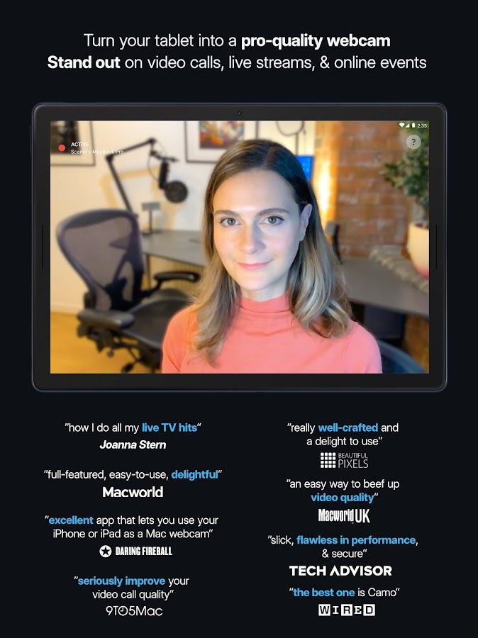 — Быстрее, чем веб-камера: Camo переносит всю обработку на ваше устройство Android, сохраняя ваш компьютер прохладным и быстрым.
