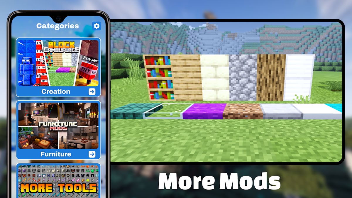 ВНИМАНИЕ: В этом приложении для minecraft pocket edition вы также можете найти BlockLaucker и установить огромное количество различных дополнений: скины, моды, пакеты текстур и ресурсов, шейдеры, обои для вашего мобильного устройства и многое другое. Удивите своих друзей этим камуфляжным дополнением, секретными комнатами и многим другим в minecraft pe.