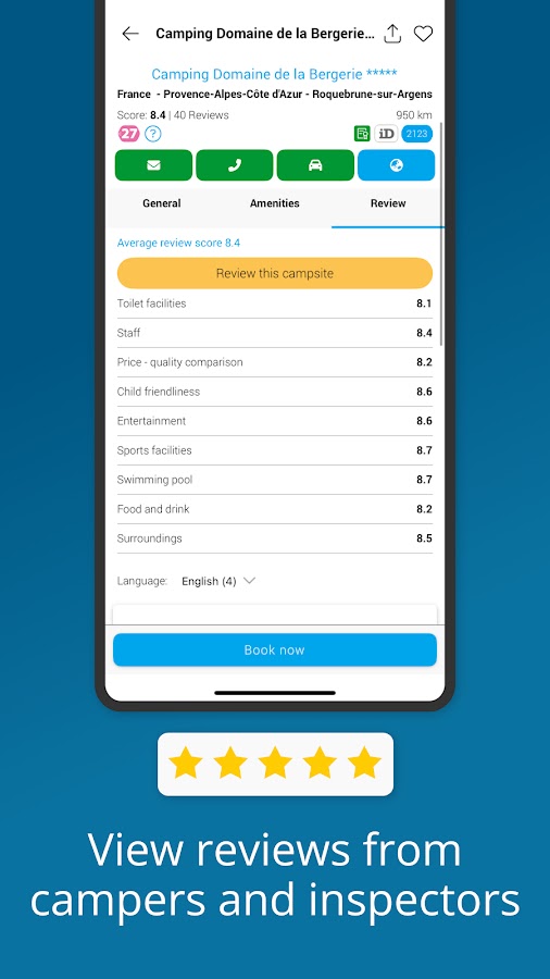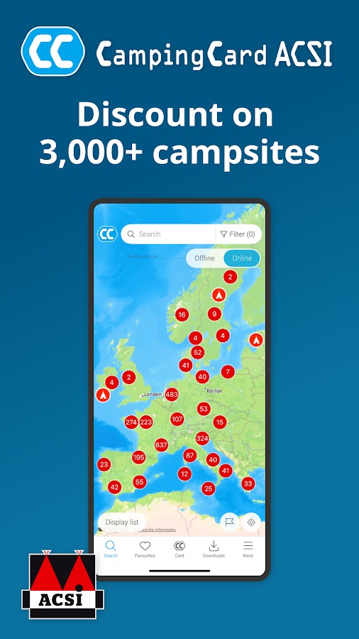 С помощью приложения CampingCard ACSI вы можете искать среди более чем 150 объектов, таких как бассейн, Wi-Fi, места для размещения с домашними животными, детские площадки, прибрежные районы, оздоровительные центры и многое другое, чтобы найти кемпинг, который лучше всего соответствует вашим потребностям во время отдыха. Вы можете использовать приложение для прямого бронирования или сохранить понравившиеся кемпинги для последующего бронирования.