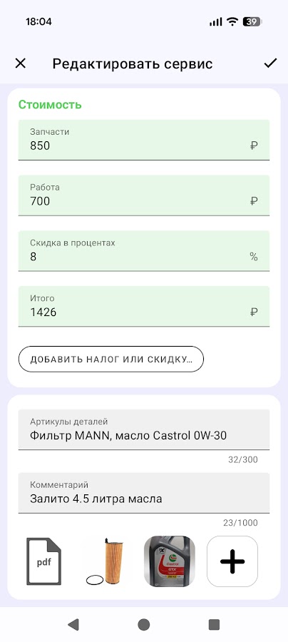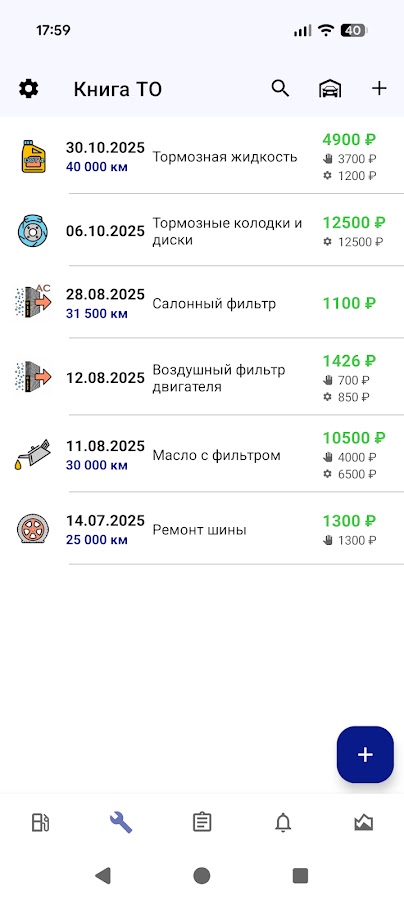 • Сервисная книжка: можно добавить замену масла, колодок и прочие опреации по ремонту автомобиля. Можно отдельно указать стоимость запасных частей и стоимость рабочей силы. Можно прикрепить фотографии к этой сервисной книжке. Можно сфотать все, что важно не забыть потом: производитель и сорт масла, квитанции или лицо того, кто ремонтировал машину! Работы по сервису автомомбиля и бумажные расходы (старховка ОСАГО, КАСКО и т.д.) учитываются отдельно. Обычно расходы на автосервис гораздо важнее, но также важно не забывать о сроке действия страховки.