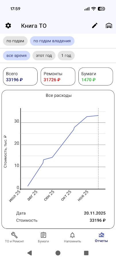 • Учет расходов на автомобиль: смотрите подробные графики расходов по месяцам или годам владения. Если интерсно узнать, сколько денег требуется автомобилю на техническое обслуживание или как затраты растут из года в год, забивайте все расходы в эту сервисную книжку и смотрите на графики. Налоги, штрафы, страховка учитываются отдельно и отображаются на графиках отдельно.