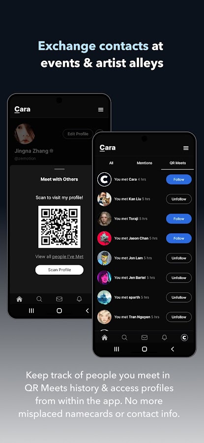 — Следите за людьми, которых встречаете на мероприятиях, с помощью QR-кодов Cara! Больше не нужно фотографировать визитки на аллеях художников или терять чью-то контактную информацию.