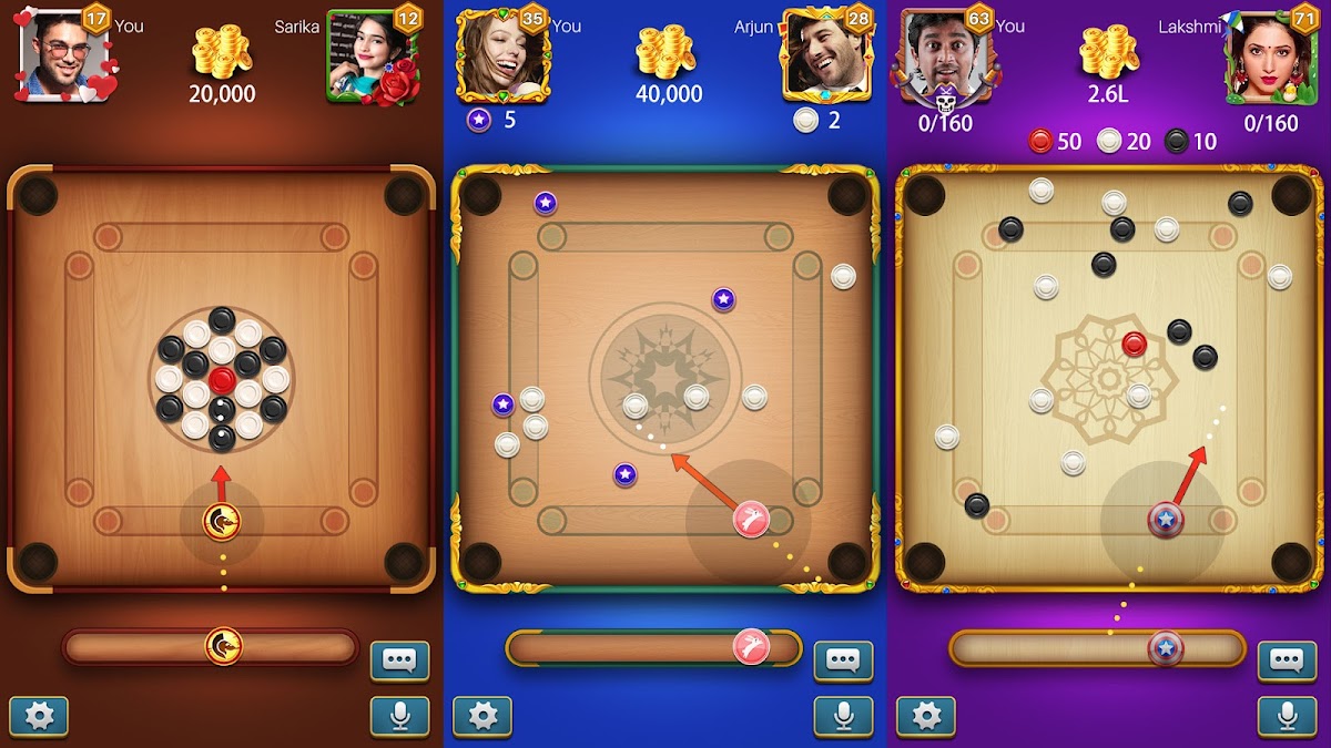 КЛАССИЧЕСКИЙ КАРРОМ: Каждый игрок должен забить шар выбранного цвета в лунку, а затем преследовать красный шар, также известный как «королева». Попадание в королеву и последний шар подряд принесет победу в настоящем карроме.