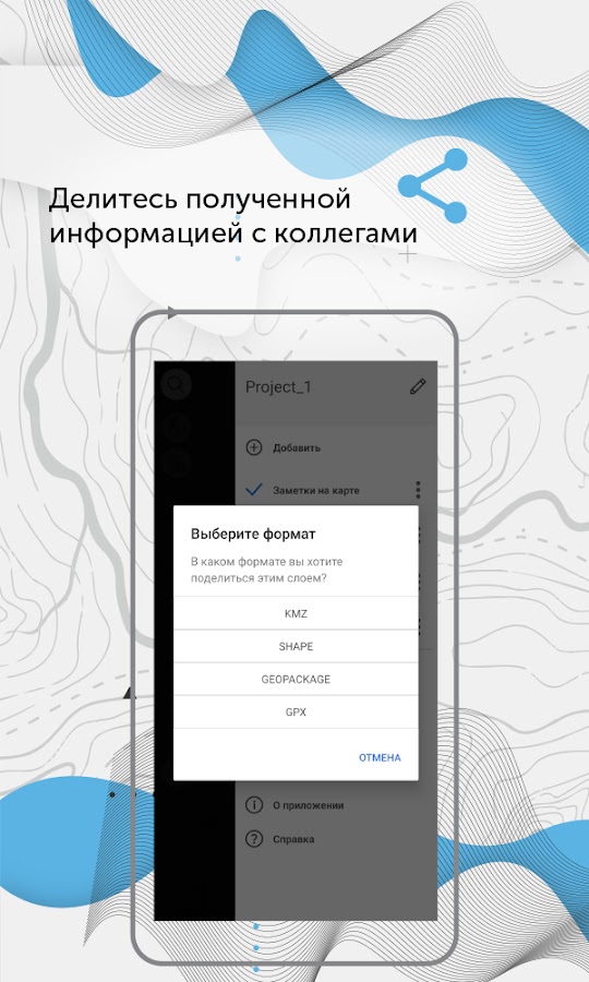 — Делитесь собранными данными в форматах GPKG (GeoPackage), KML/KMZ, GPX и SHP.