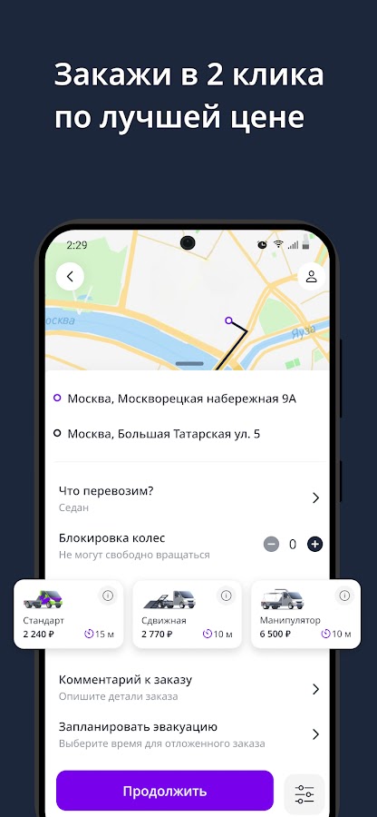 Скачайте приложение CarTaxi, чтобы заказать эвакуатор. Помощь на дороге в несколько кликов! Выберите своё местоположение, адрес доставки, укажите машину и её неисправности – всё! Через секунды ближайший эвакуатор выезжает на помощь. Если планы вдруг поменялись, вы можете сменить точку доставки или отменить заказ, пока машина в пути.