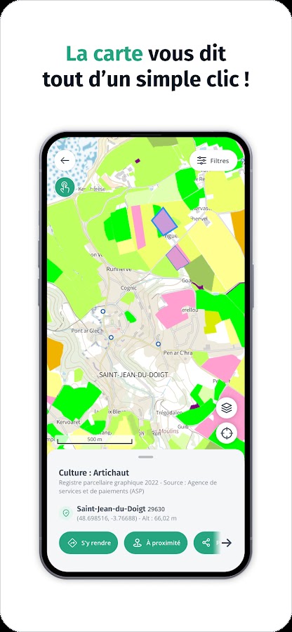 Хороший план ! Нажмите на интерактивную карту, чтобы получить дополнительную информацию о территории Франции, например, характеристики здания или тип обработки поля.