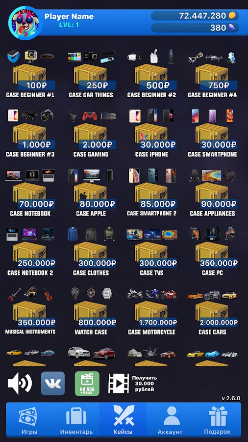 Испытайте удачу прямо сейчас. Это кейс симулятор увлекательная игра со множеством сюрпризов. кейс симулятор позволяет открывать кейсы с настоящими вещами, такими как сотовые телефоны, ноутбуки или даже автомобили. Откройте кейсы и получите самое ценное. Посмотрите на свою карму, используя нашу систему кейсов. Эта игра отличается от других симуляторов. Чего же ты ждешь ? Играть сейчас детские игры!