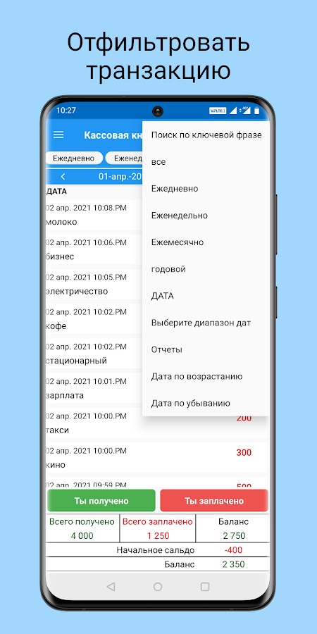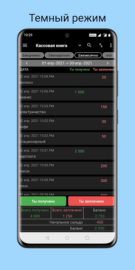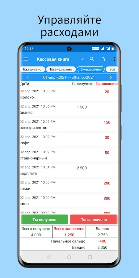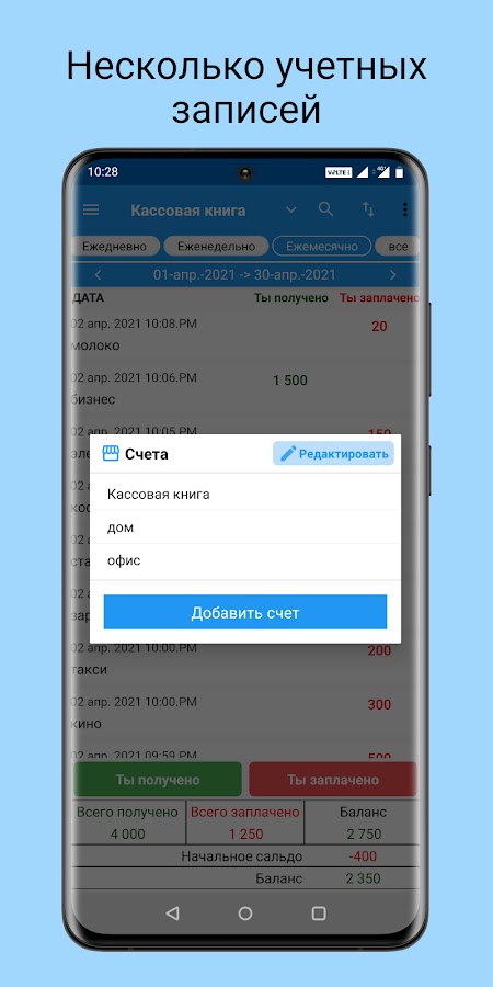 ➕ Несколько счетов: Создавайте отдельные кассовые книги для разных задач — личные расходы, бизнес-финансы или отдельные проекты. Держите всё в идеальном порядке!