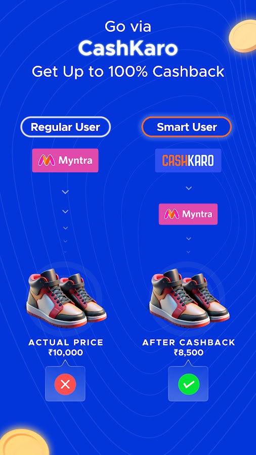 Добро пожаловать в CashKaro, крупнейшее в Индии приложение для возврата денег и купонов на скидку. CashKaro дает вам настоящий кэшбэк при совершении покупок в Интернете на Flipkart, Amazon, Myntra, Nykaa и многих других сайтах.